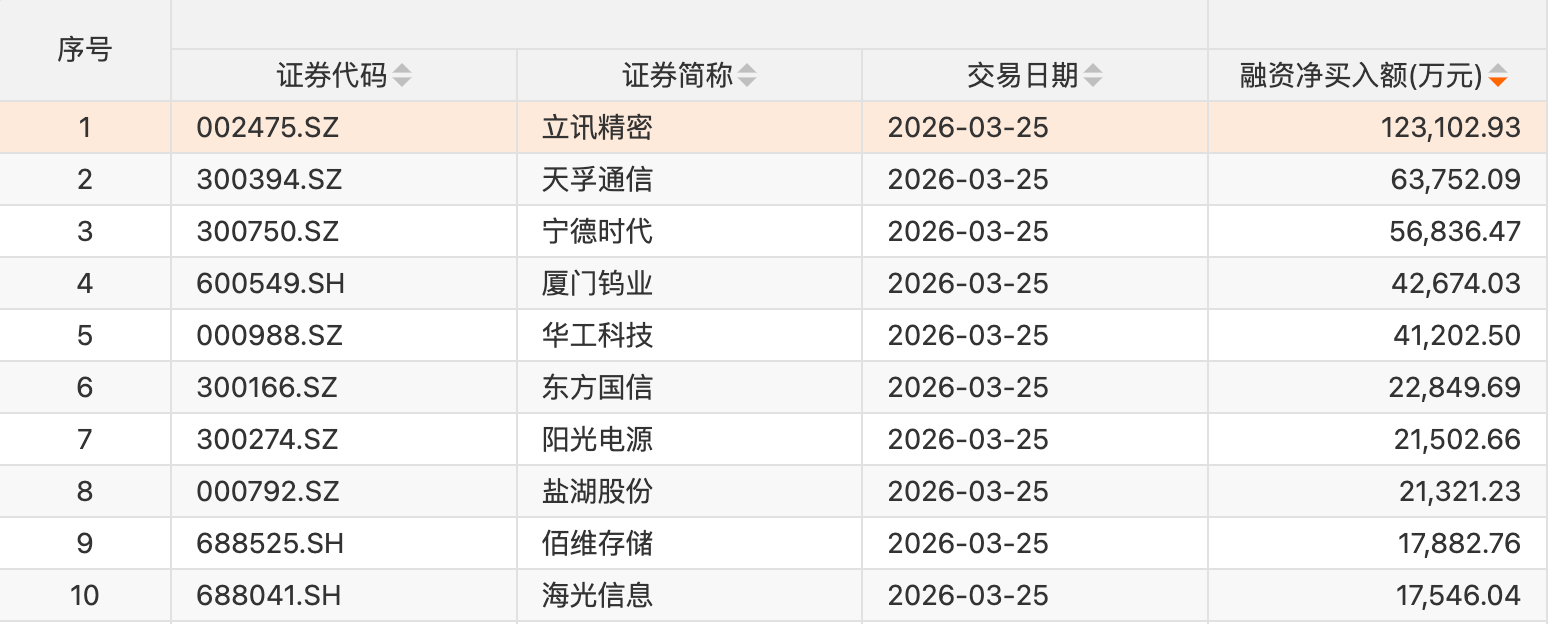 个股方面,32只个股获融资净买入额超1亿元。立讯精密获融资净买入额居首,净买入12.31亿元;融资净买入额居前的还有天孚通信、宁德时代、厦门钨业、华工科技、东方国信、阳光电源、盐湖股份、佰维存储、海光信息。