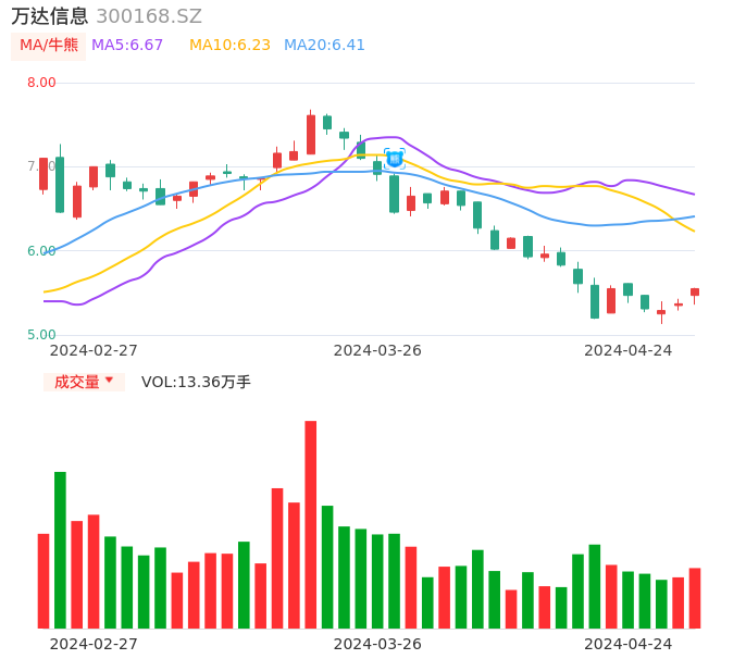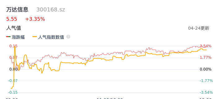 04月24日,万达信息收报5.55,股价涨幅3.35%,成交金额7311.09万元,换手率0.98%。