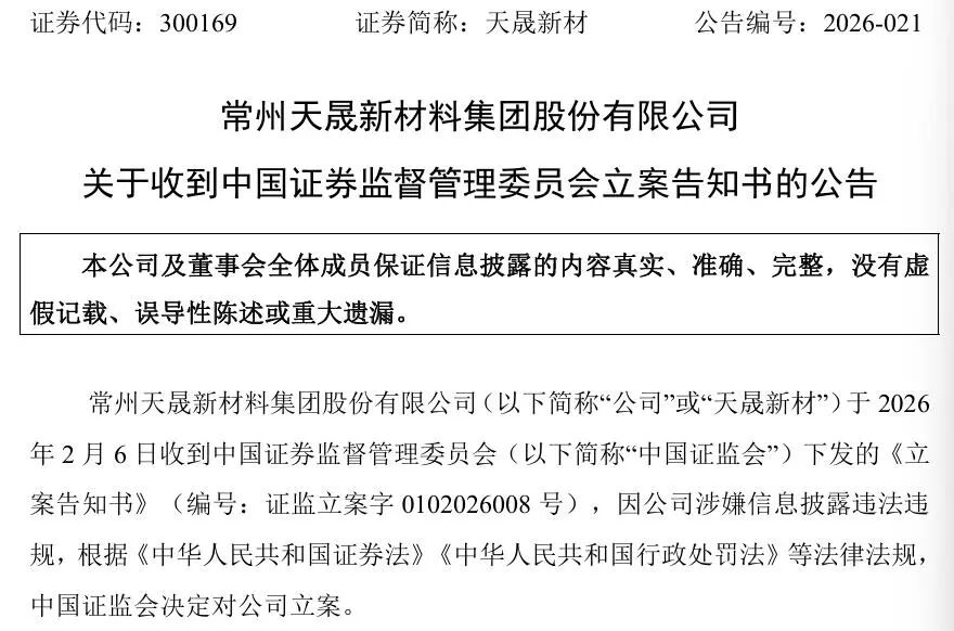 嫌信息披露违法违规,根据《中华人民共和国证券法》《中华人民共和国行政处罚法》等法律法规,中国证监会决定对天晟新材立案。