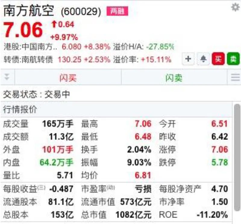 航空股同样表现不俗,A股港股中的航空板块全线大涨。A股中,南方航空涨停。港股中,截至发稿南方航空和东方航空均涨超8%。