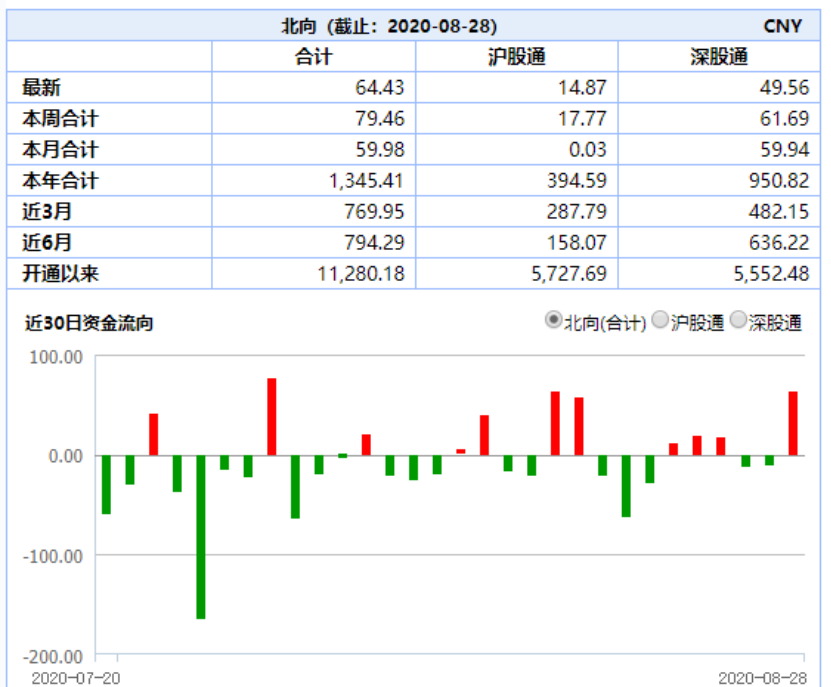 北向资金方面,Wind数据显示,截至收盘北向资金全天净流入64.43亿元,创近1个月来日净流入规模新高。其中沪股通资金净流入14.87亿元,深股通资金净流入49.56亿元。本周北向资金累计净流入79.46亿元,其中沪股通资金净流入17.77亿元,深股通资金净流入61.69亿元。