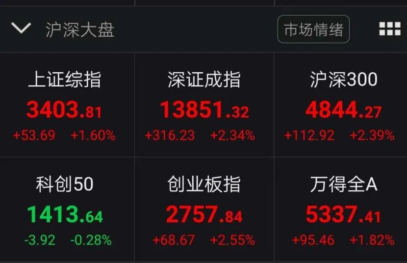 从板块来看,28个申万一级行业今日全线飘红,休闲服务板块大幅收涨5.76%高居第一;医药生物、家用电器跟涨,截至收盘分别上涨2.95%、2.84%;沉寂多日的军工板块今日重拾涨势,截至收盘上涨2.52%;非银金融、银行今日亦纷纷收涨逾2%。