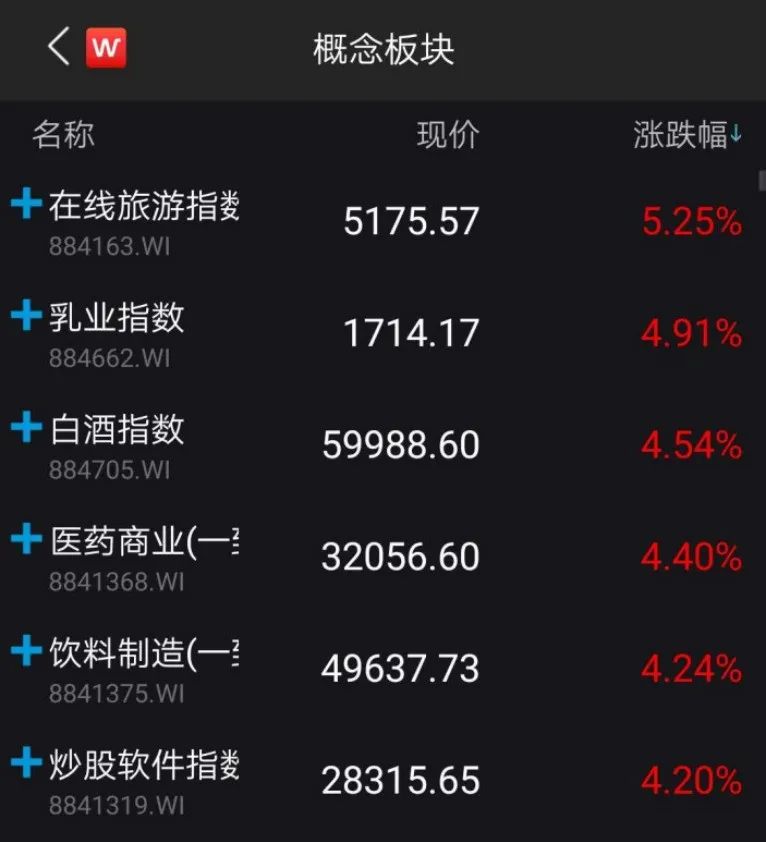 从概念板块看,今日最火的当属在线旅游,截至收盘大涨5.25%,众信旅游涨停,腾邦国际、中国中免大涨逾8%;乳业指数收涨4.91%,成分股中伊利股份、光明乳业双双涨停;白酒亦有不错表现,截至收盘白酒指数收涨4.54%,舍得酒业、酒鬼酒两只个股涨停。