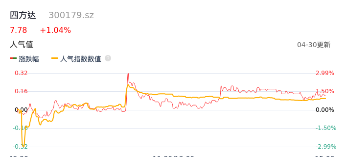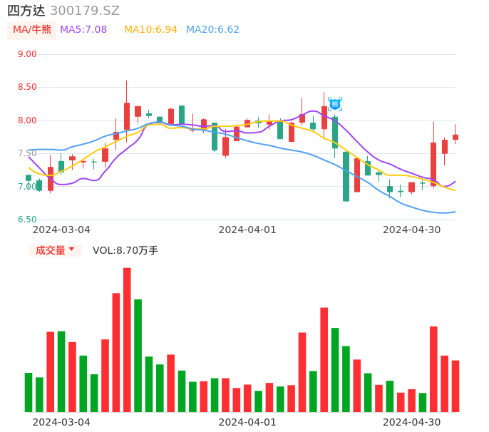 04月30日,四方达收报7.78,股价涨幅1.04%,成交金额6764.81万元,换手率2.31%。