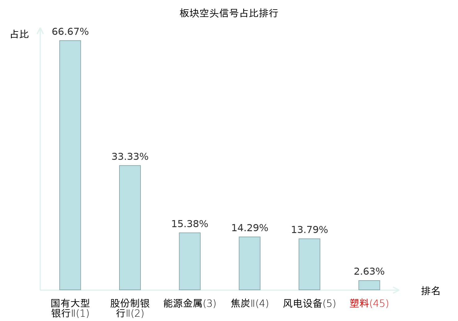 全市场所有行业板块中主力空头信号占比排名中,国有大型银行Ⅱ板块位居第一。风电设备板块名次提升最快,较昨日上升126位。