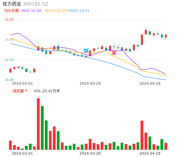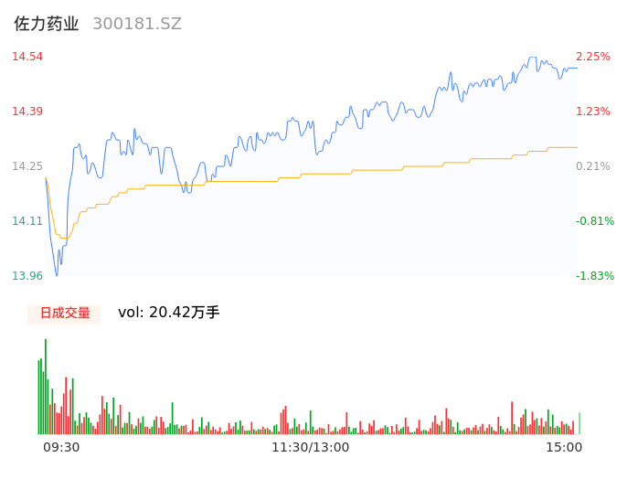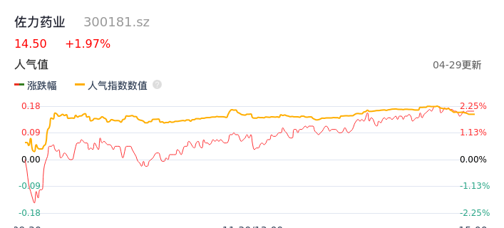 04月29日,佐力药业收报14.50,股价涨幅1.97%,成交金额2.92亿元,换手率3.40%。