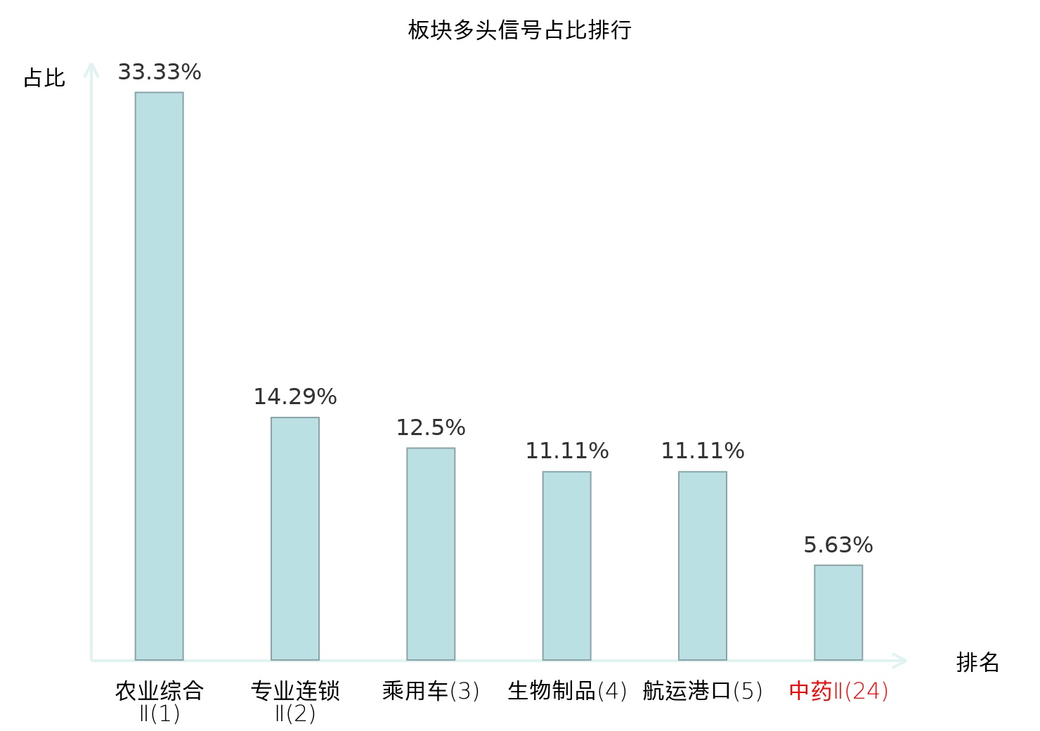 全市场所有行业板块中主力多头信号占比排名中,农业综合Ⅱ板块位居第一。专业连锁Ⅱ板块名次提升最快,较昨日上升122位。