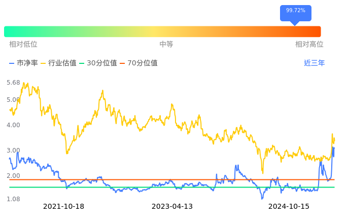 力源信息当前市净率PB为3.08,在所属的其他电子中,市净率PB排15,前五名分别为太龙股份市净率1.96、新亚制程市净率2.05、维峰电子市净率2.21、远望谷市净率2.23、东南电子市净率2.25。力源信息当前市净率PB为3.08,超过近3年99.72%的历史数据。