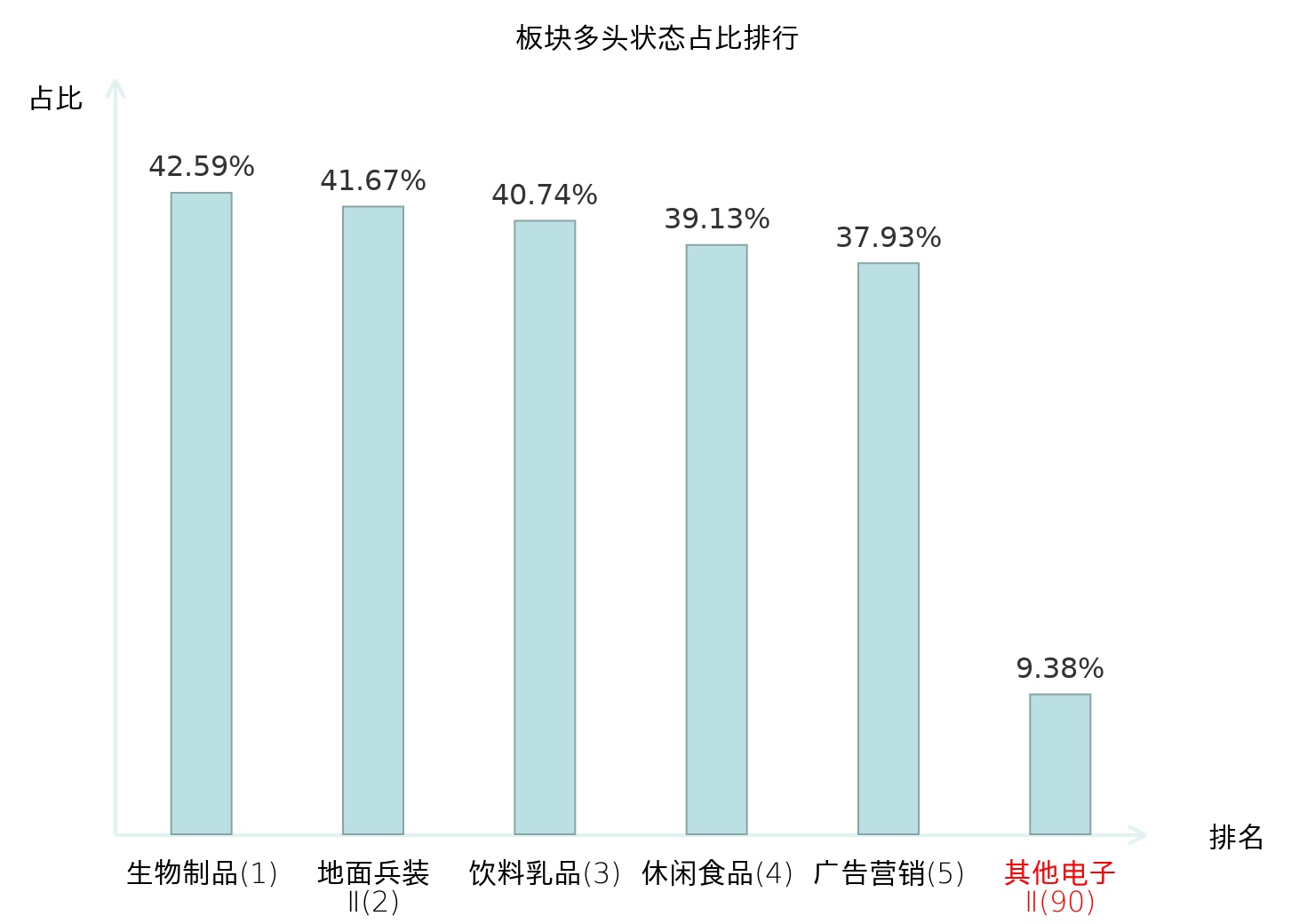 全市场所有行业板块中主力多头状态占比排名中,生物制品板块位居第一。黑色家电板块名次提升最快,较昨日上升65位。