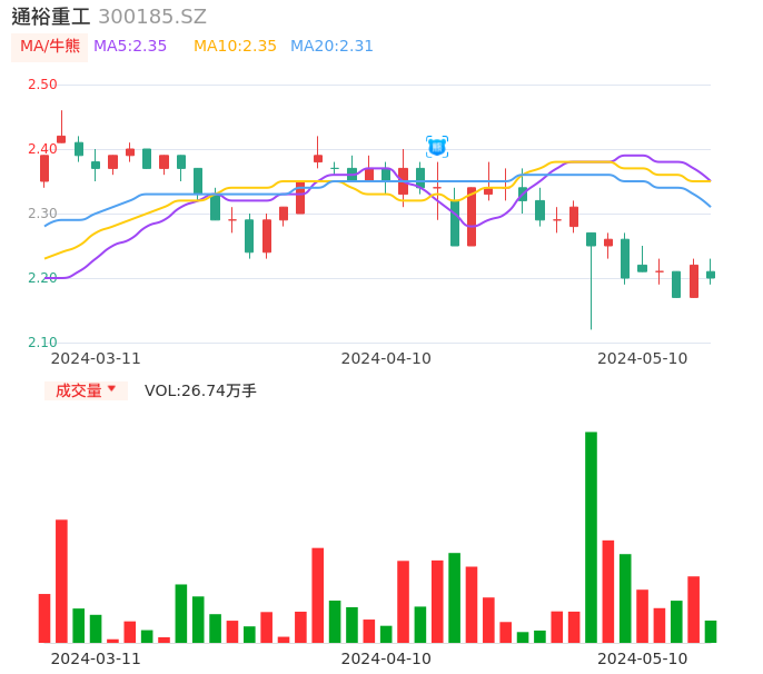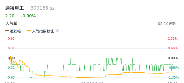 05月10日,通裕重工收报2.20,股价涨幅-0.90%,成交金额5898.83万元,换手率0.72%。