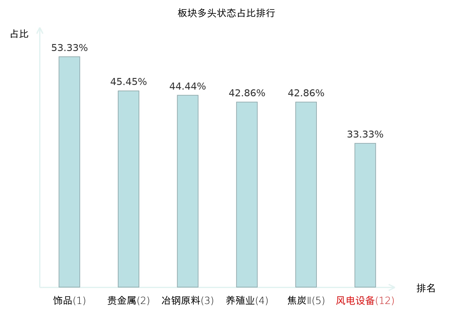全市场所有行业板块中主力多头状态占比排名中,饰品板块位居第一。非金属材料Ⅱ板块名次提升最快,较昨日上升58位。