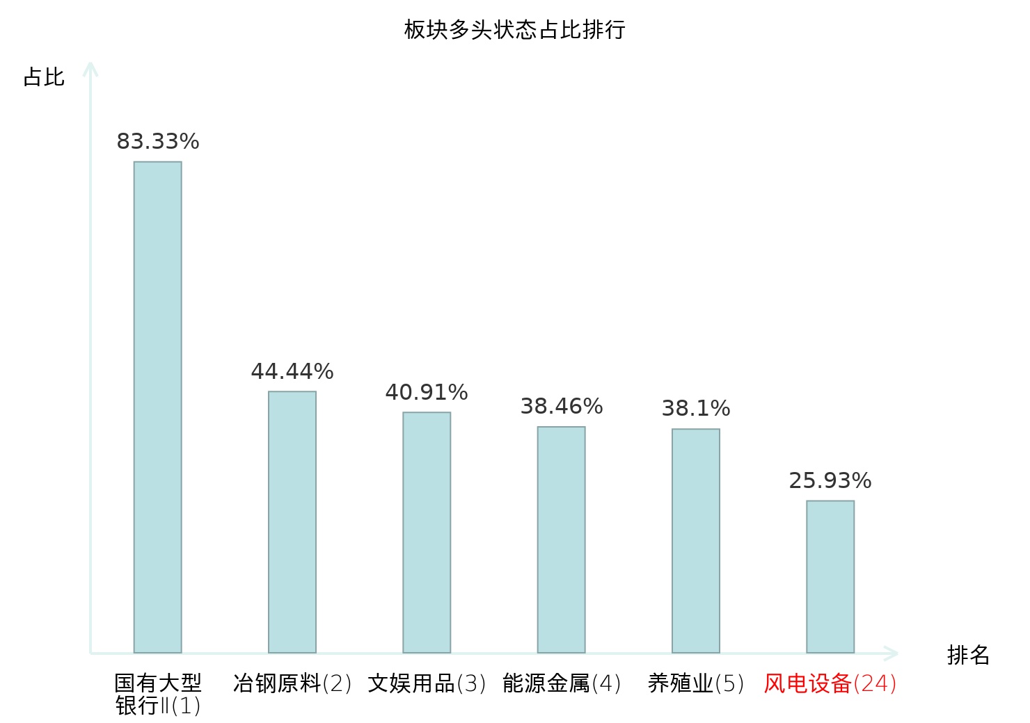全市场所有行业板块中主力多头状态占比排名中,国有大型银行Ⅱ板块位居第一。影视院线板块名次提升最快,较昨日上升54位。