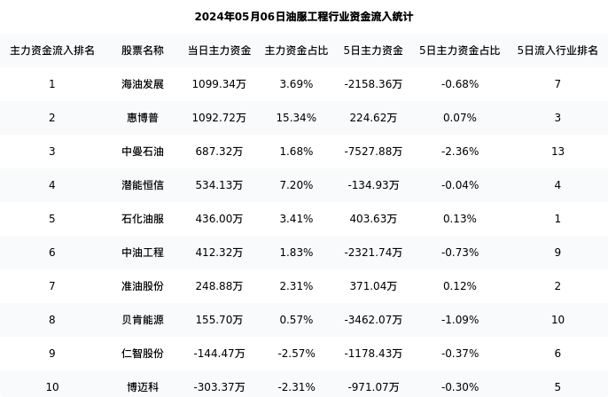 从主力资金流向来看,油服工程行业今日主力资金流入6.59亿元,在所有申万二级行业中排名:101/131。
