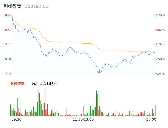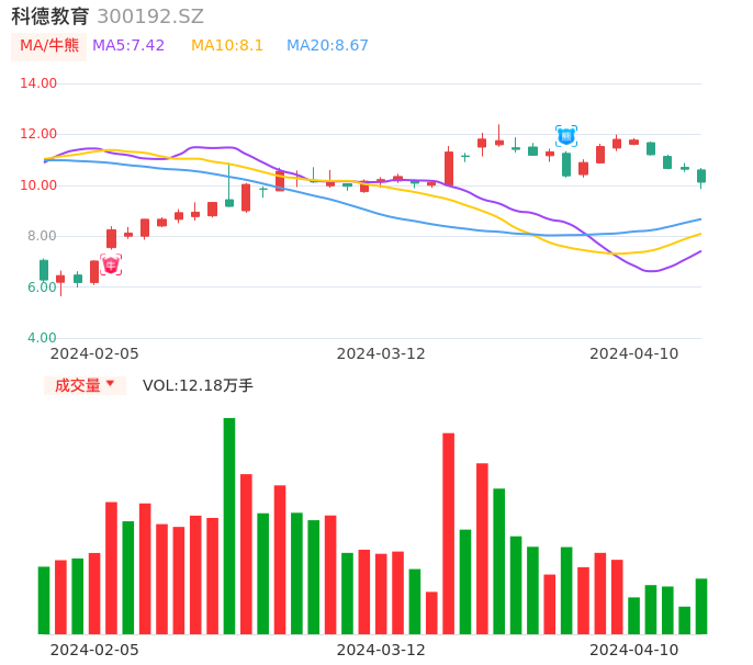04月10日,科德教育收报10.12,股价涨幅-4.80%,成交金额1.23亿元,换手率5.48%。