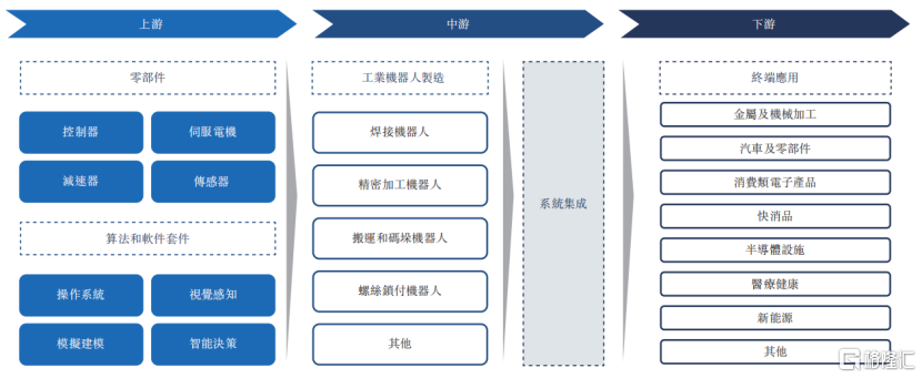 中游涵盖机器人制造商与系统集成商,负责组装焊接机器人、精密加工机器人、搬运和码垛机器人、螺丝锁付机器人等工业机器人,并提供集成自动化解决方案。系统集成商则开发定制化机器人应用解决方案。