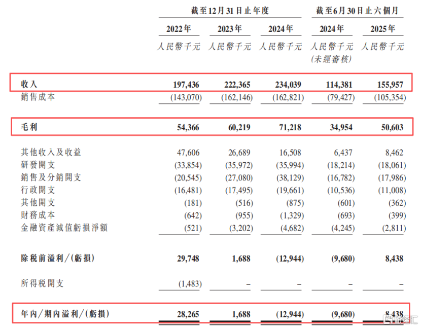 2022年、2023年、2024年及2025年1-6月(报告期),公司的收入分别为1.97亿元、2.22亿元、2.34亿元、1.56亿元,分别录得净利润2830万元、170万元、-1290万元、840万元。