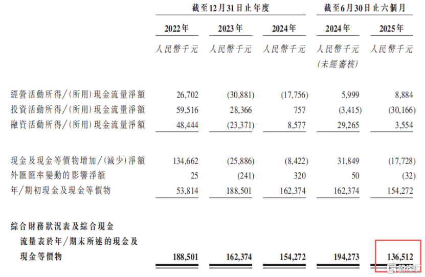 2023年和2024年,卡诺普机器人的经营活动现金净额为-3088万元、-1776万元。截至2025年6月底,公司账上现金及现金等价物为1.37亿元,而2022年底约1.89亿元。