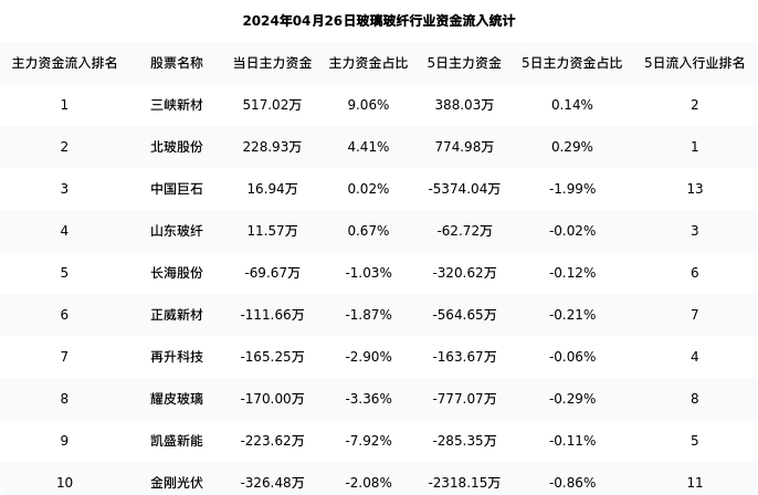 从主力资金流向来看,玻璃玻纤行业今日主力资金流入7.84亿元,在所有申万二级行业中排名:100/131。