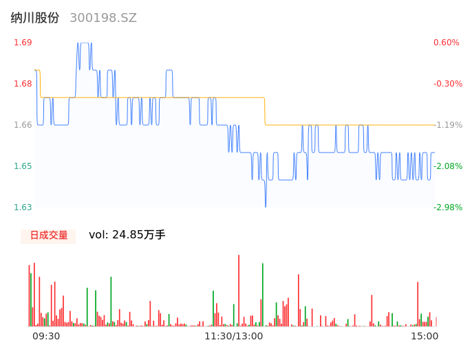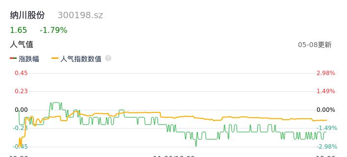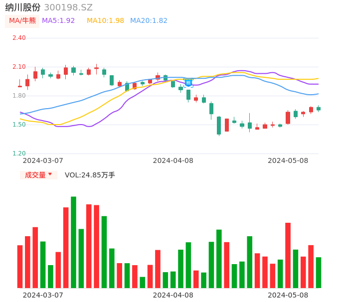05月08日,纳川股份收报1.65,股价涨幅-1.79%,成交金额4121.48万元,换手率2.74%。