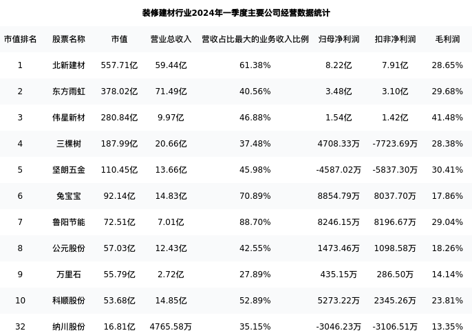 纳川股份最新报告期数据为一季度,下表汇总了装修建材行业内市值靠前的公司一季度主要经营数据
