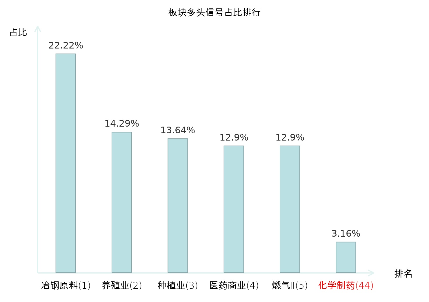 全市场所有行业板块中主力多头信号占比排名中,冶钢原料板块位居第一。航天装备Ⅱ板块名次提升最快,较昨日上升114位。