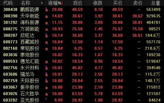 A股锂电产业链股盘中强势拉升,截至收盘,鹏辉能源20%涨停,天华新能涨近15%,万润新能、欣旺达等涨超10%,永兴材料、石大胜华等多股涨停,天齐锂业逼近涨停,赣锋锂业涨超5%。