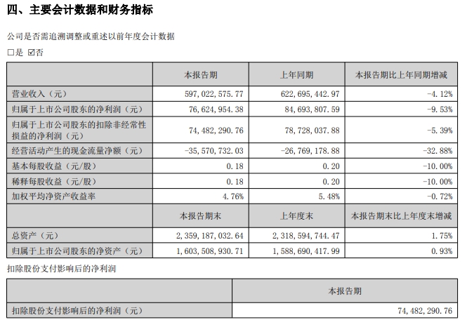 上证报中国证券网讯 8月21日,高盟新材发布2025年半年度报告。2025年上半年,公司实现营业总收入5.97亿元,同比下降4.12%;归母净利润7662.5万元,同比下降9.53%;扣非净利润7448.23万元,同比下降5.39%;经营活动产生的现金流量净额-3557.07万元。据高盟新材2025年第一季度报告,今年一季度,公司实现归属于上市公司股东的扣除非经常性损益的净利润3602万元,较2024年一季度降低24.52%。由此看,公司上半年净利润整体降幅较一季度明显收窄。