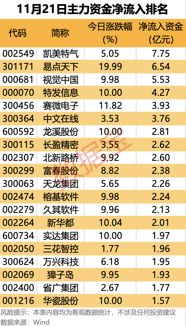 此外,还有视觉中国、特发信息、赛微电子、中文在线、龙溪股份等主力资金净流入居前。