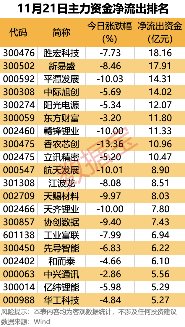 胜宏科技和新易盛主力资金净流出居前,金额分别为18.16亿元、17.91亿元。