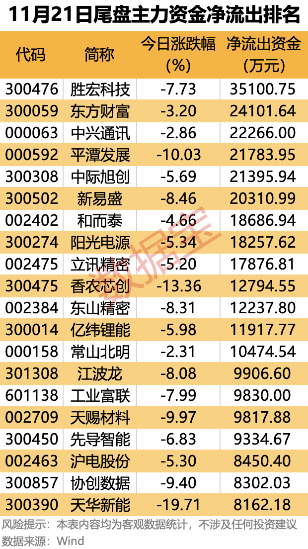 胜宏科技、东方财富、中兴通讯、平潭发展、中际旭创和新易盛等热门股尾盘净流出金额居前,均超2亿元。