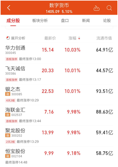 下午开盘后,受央行数字货币研究所与滴滴战略合作的影响,数字货币板块个股普涨,多股涨幅巨大。截至收盘,数字货币板块指数收涨5.1%,今日仅次于军工、证券板块的表现,银之杰、华力创通、飞天诚信等多股涨停,聚龙股份则已是连续第2个涨停板。