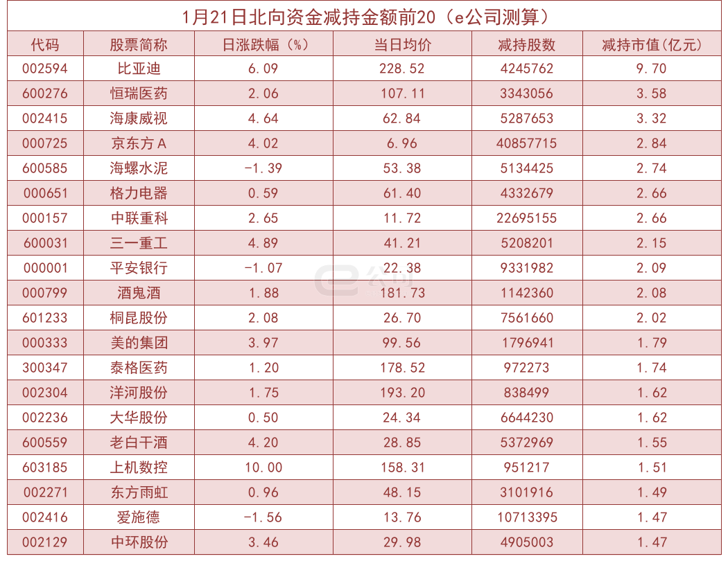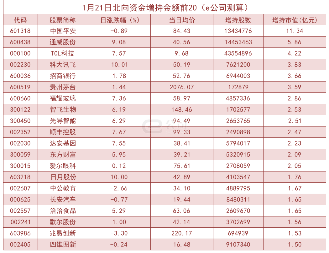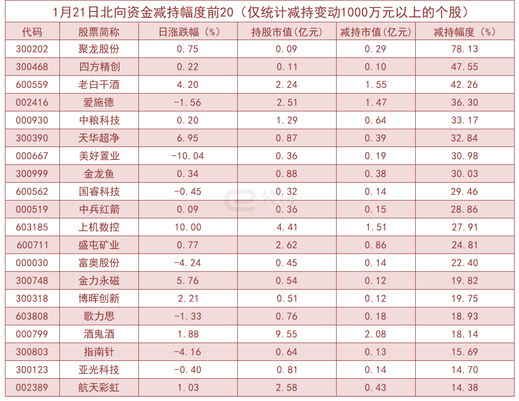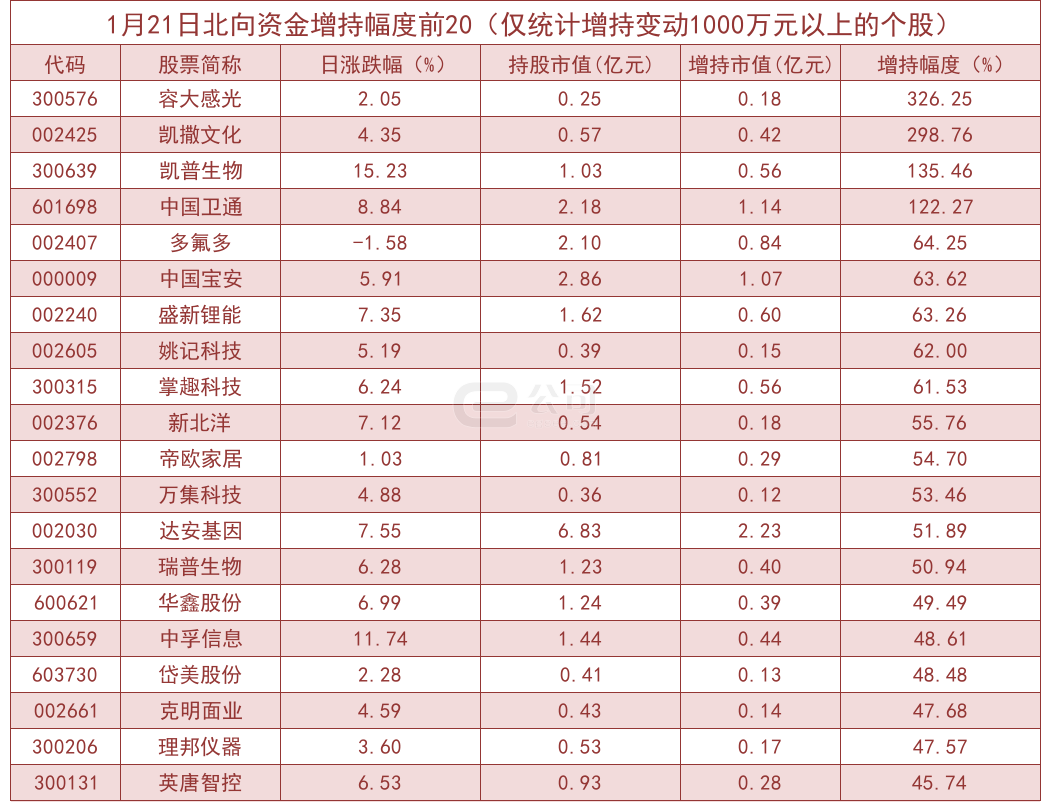 据e公司测算,增减持变动1000万元以上的个股中,容大感光、凯撒文化、凯普生物、中国卫通等获北向资金大幅增持,分别为326.25%、298.76%、135.46%、122.27%。而聚龙股份、四方精创、老白干酒、爱施德等减持幅度较大,分别减持78.13%、47.55%、42.26%、36.30%。