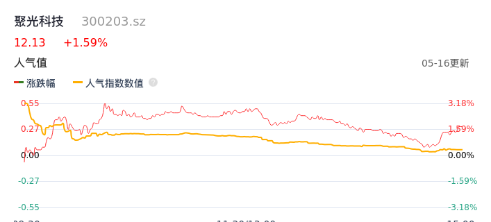 05月16日,聚光科技收报12.13,股价涨幅1.59%,成交金额8318.87万元,换手率1.53%。