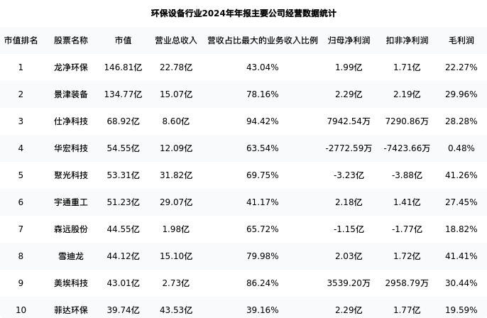 聚光科技最新报告期数据为年报,下表汇总了环保设备行业内市值靠前的公司年报主要经营数据
