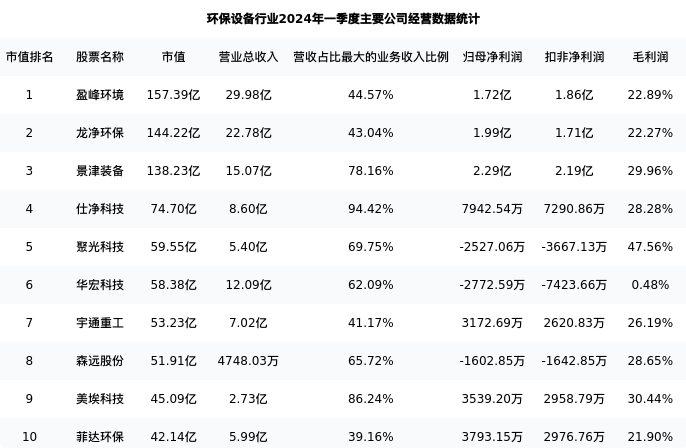 聚光科技最新报告期数据为一季度,下表汇总了环保设备行业内市值靠前的公司一季度主要经营数据