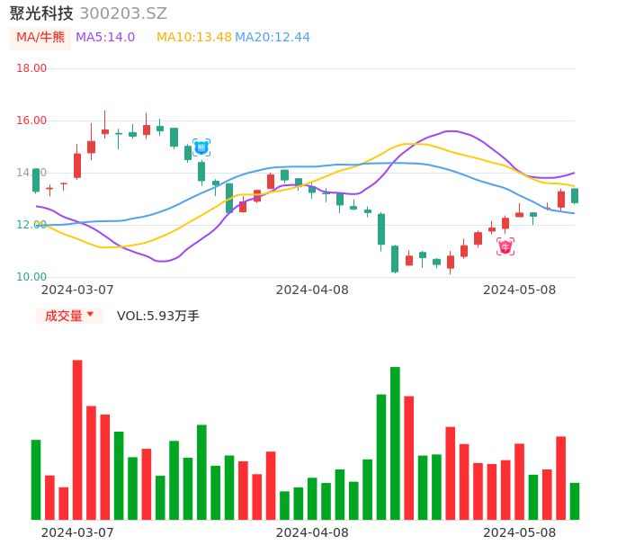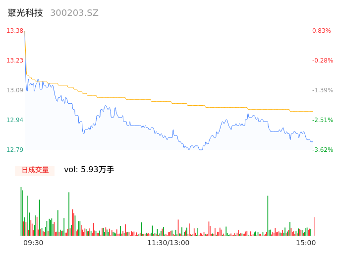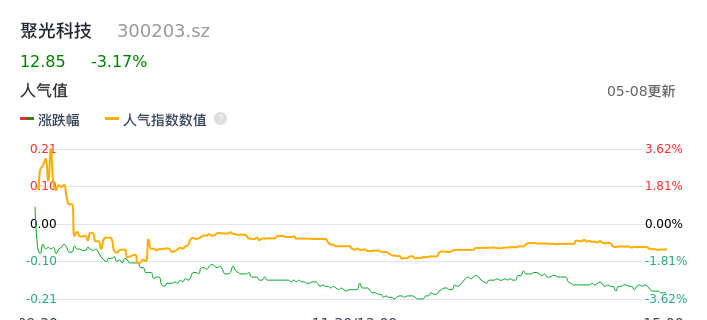 05月08日,聚光科技收报12.85,股价涨幅-3.17%,成交金额7698.25万元,换手率1.32%。