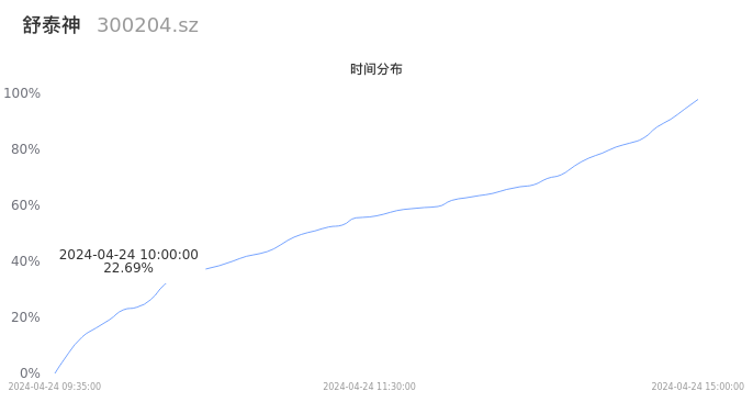 首先我们来看当日成交的时间分布。将今日交易时间按照5分钟的时间间隔进行切片,并绘制分布直方图进行观察。可以发现,10点之前的成交量占全天成交量的22.69%,这说明,该股票活跃时段换手率一般,资金热度较一般。