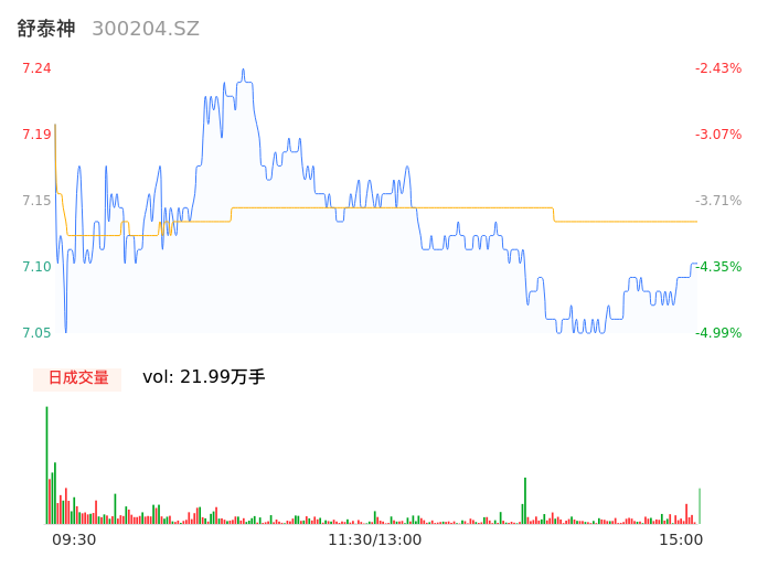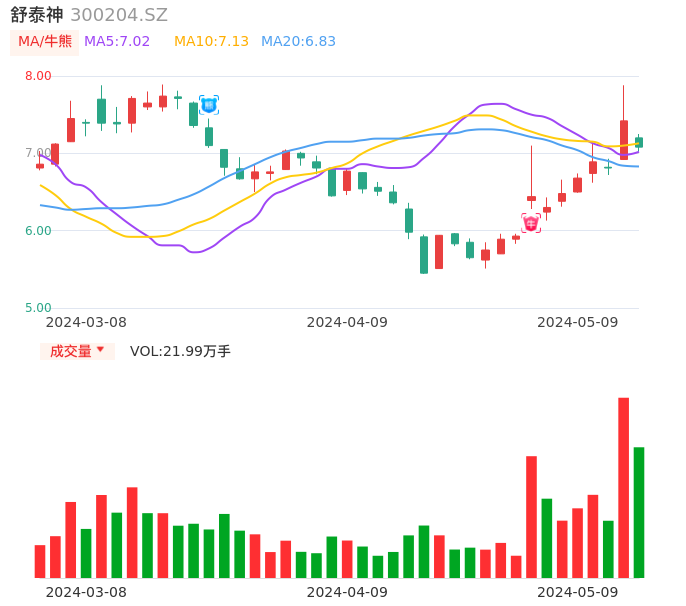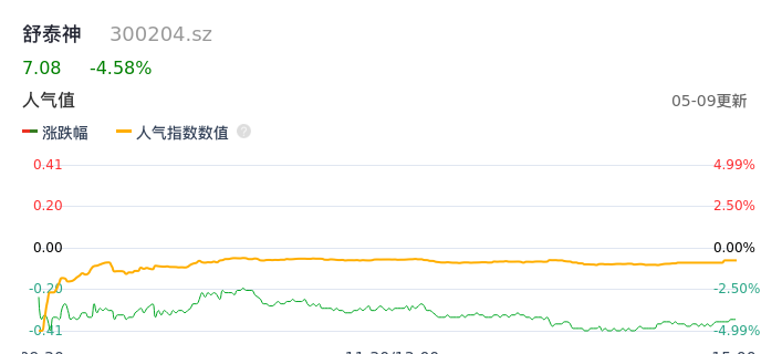 05月09日,舒泰神收报7.08,股价涨幅-4.58%,成交金额1.57亿元,换手率4.66%。