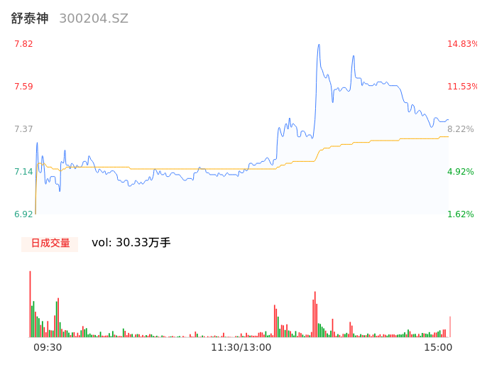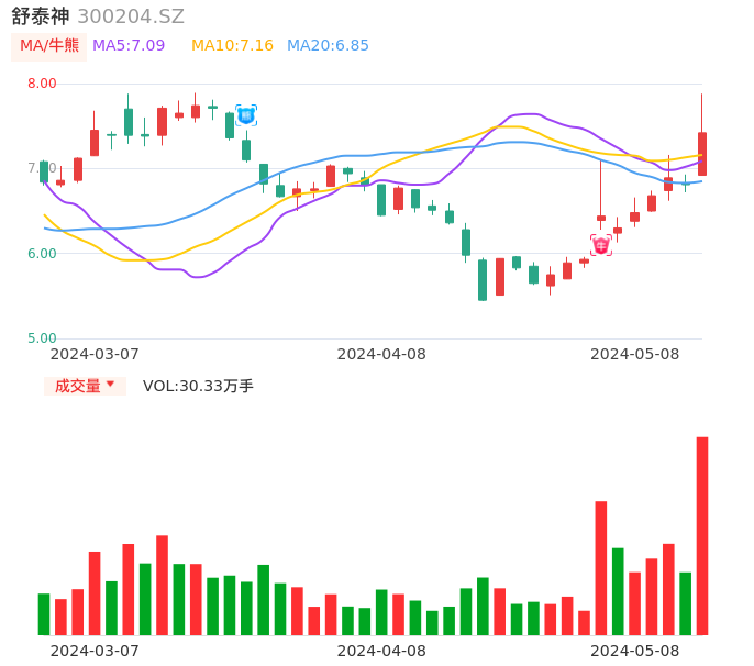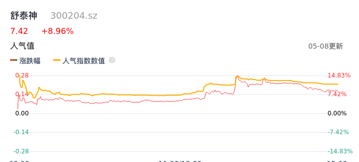 05月08日,舒泰神收报7.42,股价涨幅8.96%,成交金额2.22亿元,换手率6.43%。