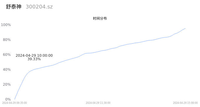 首先我们来看当日成交的时间分布。将今日交易时间按照5分钟的时间间隔进行切片,并绘制分布直方图进行观察。可以发现,10点之前的成交量占全天成交量的39.33%,这说明,该股票活跃时段换手火爆,资金热情高涨。