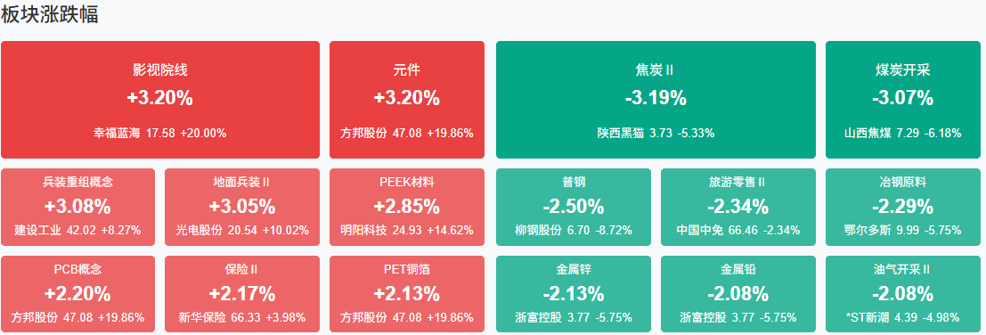 板块方面,PEEK材料、PCB概念、影视、保险等板块涨幅居前,煤炭、钢铁、海南自贸区、智谱AI等板块跌幅居前。截至收盘,沪指跌0.17%,深成指跌0.16%,创业板指涨0.1%。