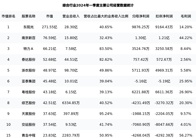 青岛中程最新报告期数据为一季度,下表汇总了综合行业内市值靠前的公司一季度主要经营数据
