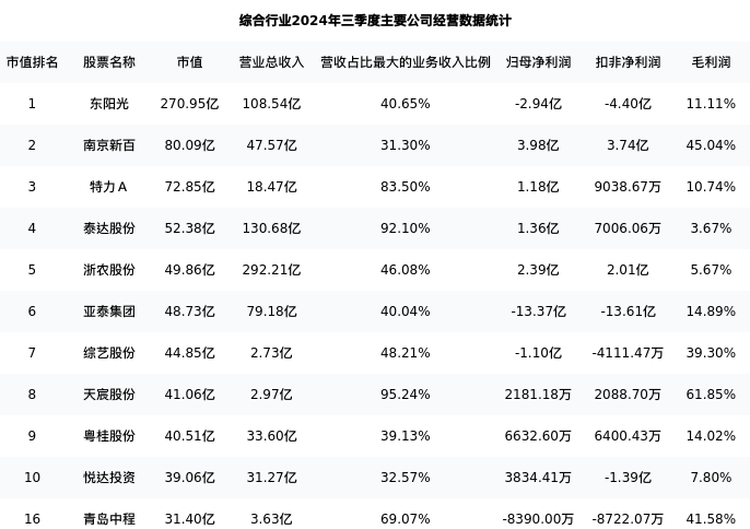 青岛中程最新报告期数据为三季度,下表汇总了综合行业内市值靠前的公司三季度主要经营数据