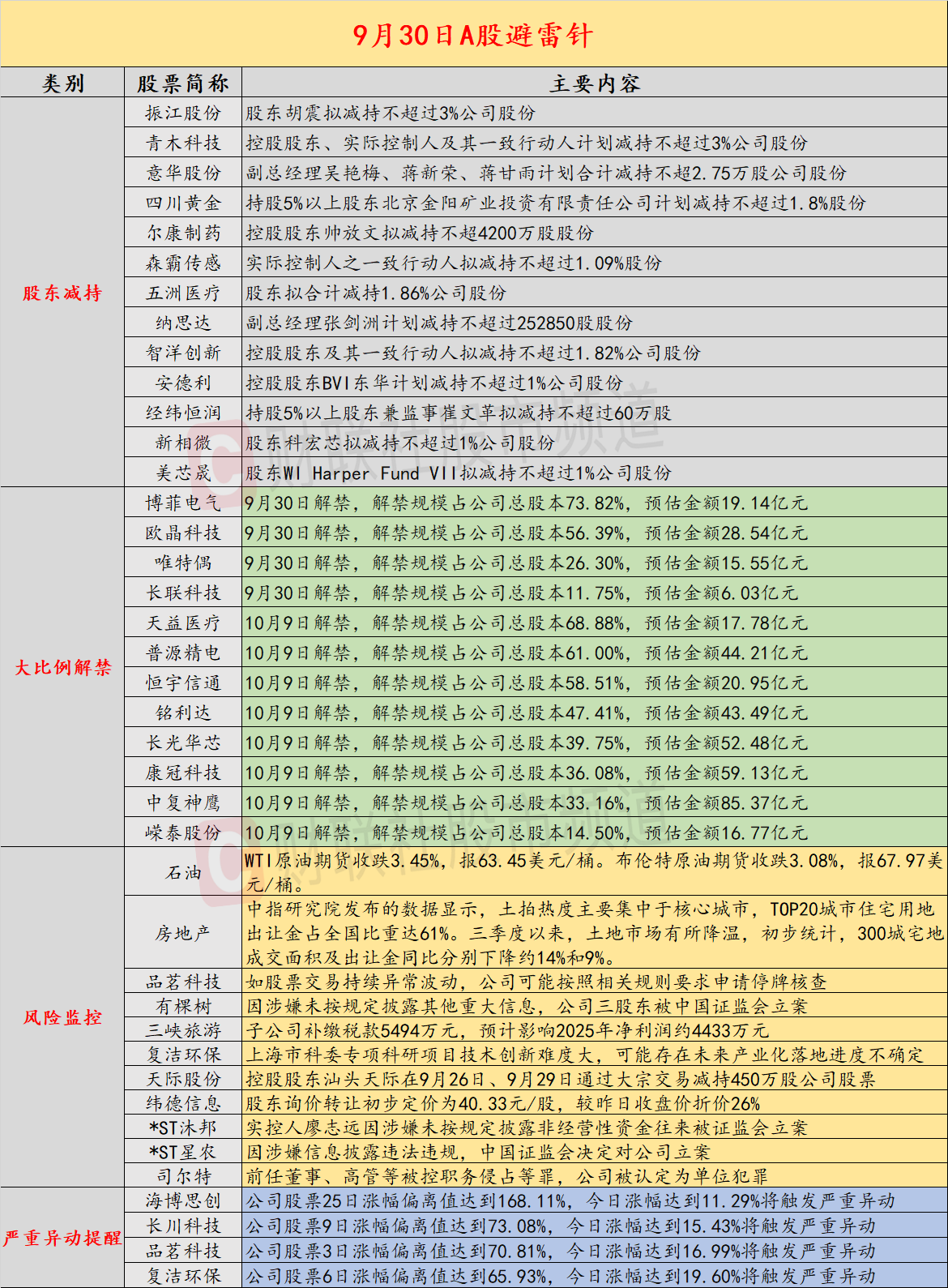 9月30日投资避雷针:20CM三连板人气股提示风险 如股票持续异常波动将申请停牌核查