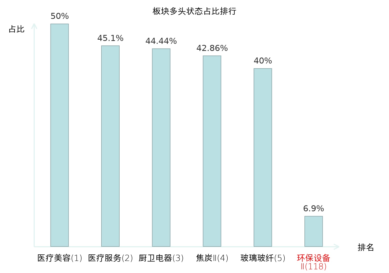 全市场所有行业板块中主力多头状态占比排名中,医疗美容板块位居第一。养殖业板块名次提升最快,较昨日上升90位。