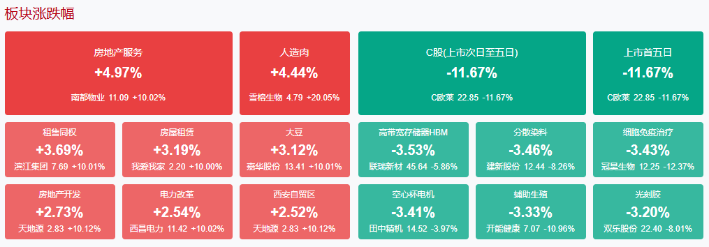 盘面上,地产股午后再度大涨,天地源、滨江集团、中交地产、招商蛇口等涨停。电力股震荡走强,西昌电力、赣能股份、乐山电力、明星电力等涨停。特高压概念股一度冲高,电科院、积成电子、远东股份涨停。合成生物概念股走势分化,人造肉方向大涨,雪榕生物、双塔食品、索宝蛋白等涨停。下跌方面,飞行汽车概念股集体调整,万丰奥威等多股跌超5%。板块方面,人造肉、房地产、电力、贵金属等板块涨幅居前,染料、ST板块、飞行汽车、半导体等板块跌幅居前。