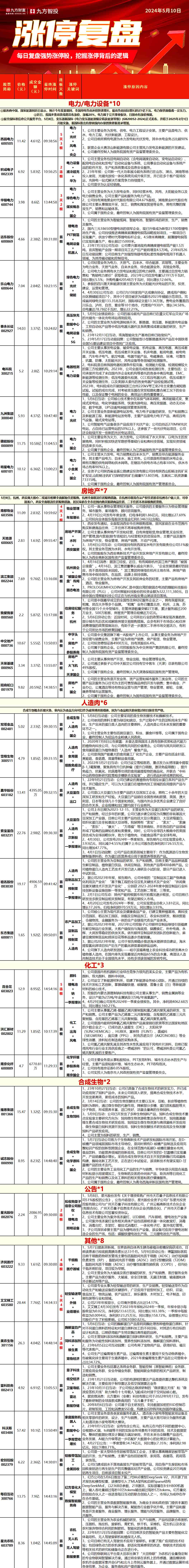 【5月10日】今日周五,市场全天震荡调整,创业板指领跌,沪指相对偏强。盘面上,地产股午后再度大涨,天地源、滨江集团、中交地产、招商蛇口等涨停。电力股震荡走强,西昌电力、赣能股份、乐山电力、明星电力等涨停。特高压概念股一度冲高,电科院、积成电子、远东股份涨停。合成生物概念股走势分化,人造肉方向大涨,雪榕生物、双塔食品、索宝蛋白等涨停。下跌方面,飞行汽车概念股集体调整,万丰奥威等多股跌超5%。