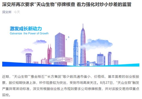 当晚,深交所发布公告称,9月8日“天山生物”触发异常波动标准,深交所依规再次对其要求停牌核查。同时,根据监控情况,“豫金刚石”“长方集团”交易与“天山生物”具有相似特征,均触发严重异常波动标准,深交所对两家公司要求停牌核查。