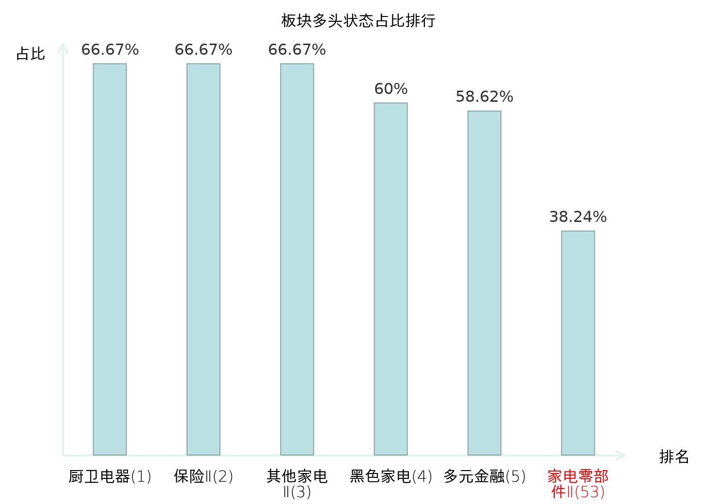 全市场所有行业板块中主力多头状态占比排名中,厨卫电器板块位居第一。其他家电Ⅱ板块名次提升最快,较昨日上升56位。