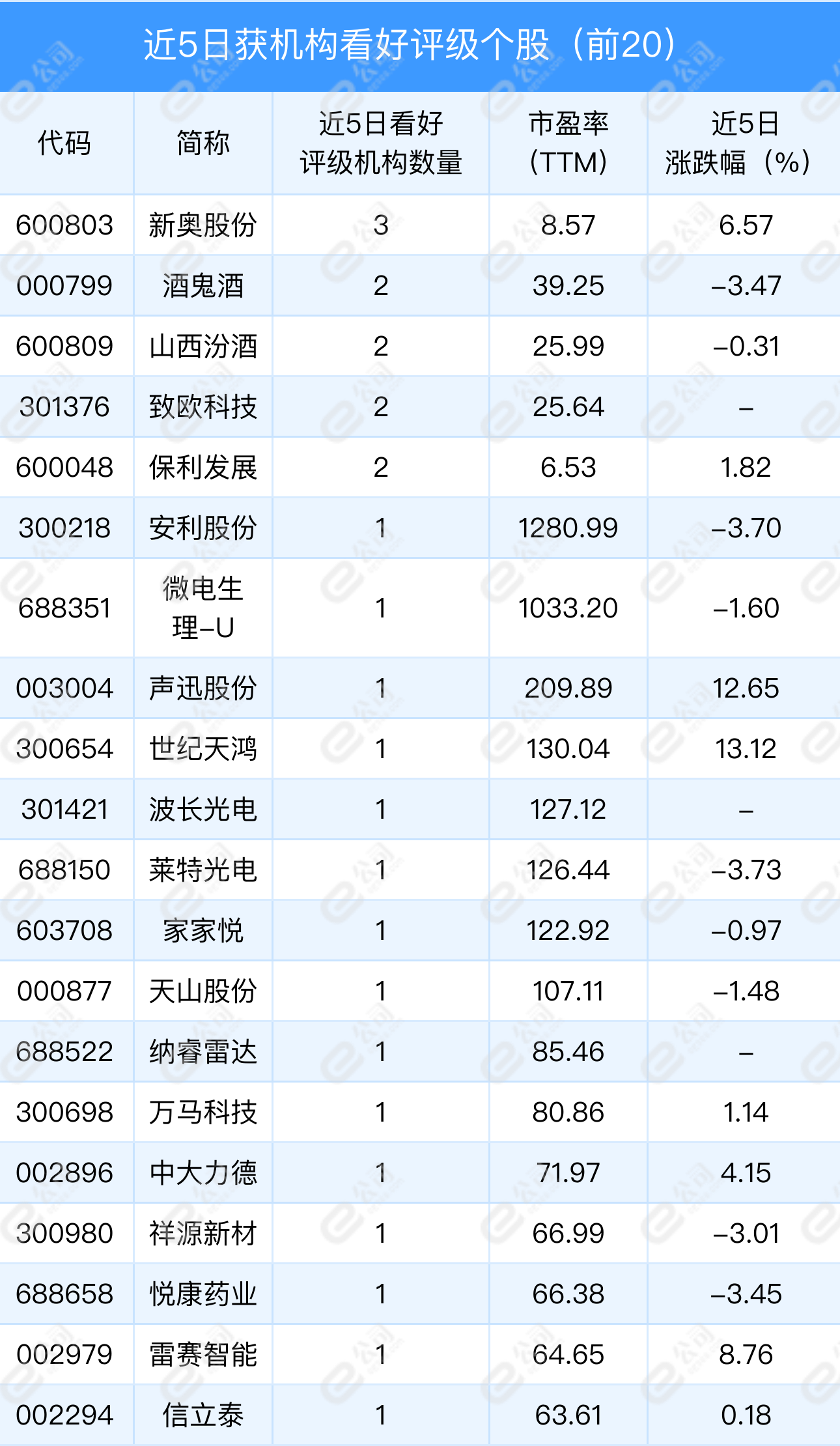 1只个股在近期被机构集中推荐,近5日内机构给予“买入”或“增持”等看好评级家数均逾3家及以上。具体来看,包括新奥股份、安利股份、酒鬼酒、山西汾酒、致欧科技等在内的6只个股期间机构看好评级家数均在2家以上。